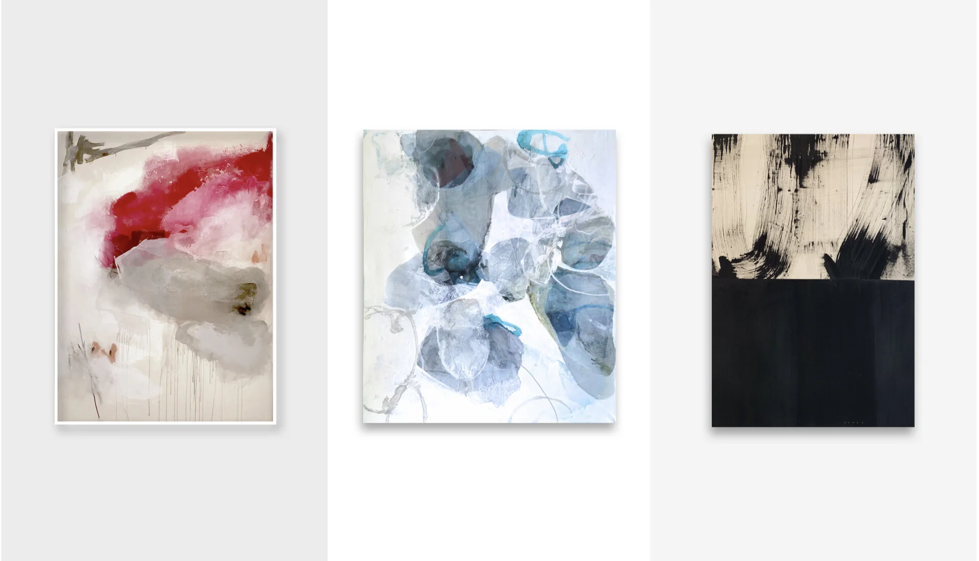 MELISSA HERRINGTON | Hands Opened. Moon Shore and Lotus Petals | mixed media on canvas | 72” x 54” || LIZ BARBER | Tide 2 | mixed media and ink on canvas | 84” x 72” || MONICA PEREZ | Peace & Strength | acrylic on canvas | 60” x 40”.